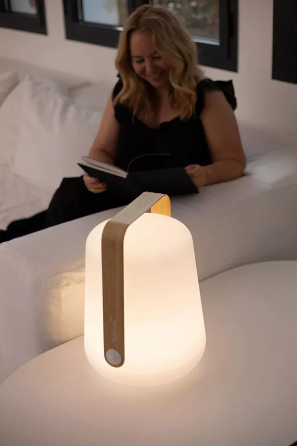 De Balad tafellamp H25 Bamboo Special Edition van Fermob heeft een diameter van 19 centimeter en een hoogte van 25 centimeter. Deze tafellamp heeft een diffuser van polyethyleen en een bamboe houten handvat. De lamp heeft een ledlamp van maximaal 0,5 Watt en is te bedienen via het lichtknopje aan de zijkant. Deze tafellamp heeft verschillende lichtstanden: cold white (6000 Kelvin), 100% neutral white (4000 Kelvin), 50% neutral white (4000 Kelvin) en Candle effect (2300 Kelvin). De lichtstand Candle-Effect heeft niet alleen de kleurentemperatuur van een kaars. Het licht flikkert ook. Deze tafellamp heeft een batterij die 7 tot 14 uur meegaat en is met behulp van de meegeleverde USB-kabel op te laden. De lamp is ook voorzien van een besparingsmodus waarin de lamp na 8 uur automatisch uitschakelt. Het opladen van de lamp duurt ongeveer 5 uur. De meegeleverde USB-kabel heeft een lengte van 2 meter. Deze tafellamp heeft een IP-waarde van 44 wat betekent dat hij schokbestendig en Uv-bestendig is. De lamp dient met een zachte, lichtvochtige doek schoongemaakt te worden.Â