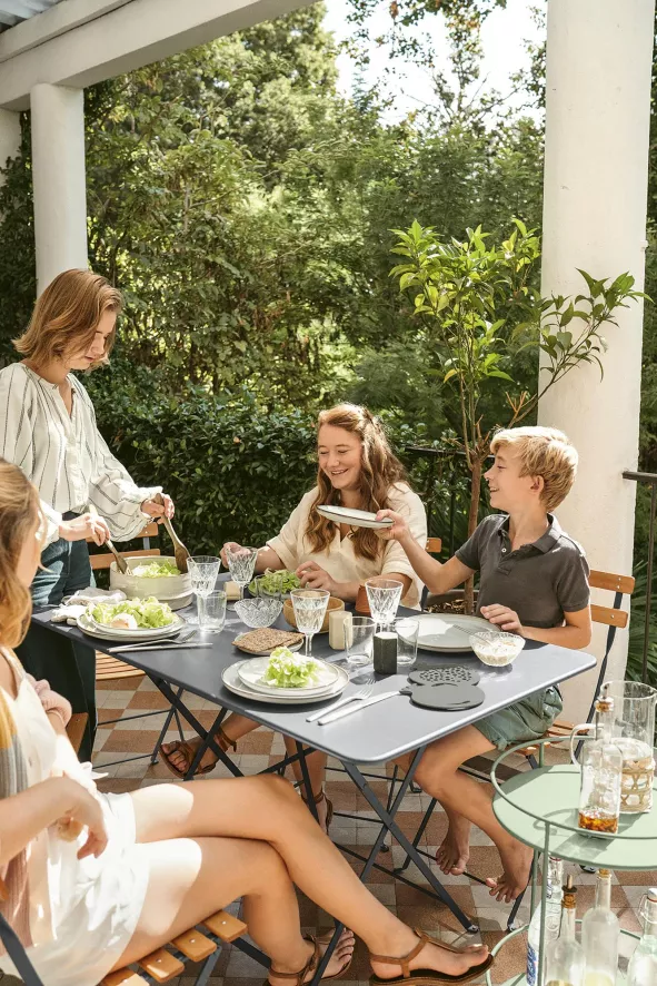 De Bistro teak tuinstoel van Fermob is 82 centimeter hoog en 39 centimeter diep. De rugleuning is 42 centimeter breed, het frame 39,5 centimeter. De zithoogte is 45 centimeter, en de zitting is 31 centimeter diep. Het frame van de stoel is gemaakt van staal, de rugleuning en de zitting zijn gemaakt van teakhout. De stoel is uitgerust met plastic clips, die ervoor zorgen dat de stoel veilig in- en uit kan worden geklapt. Het frame heeft een anti-UV poedercoating, en de stoel heeft een beschermende behandeling voor buitengebruik ondergaan. Het frame van de stoel is verkrijgbaar in verschillende kleuren.