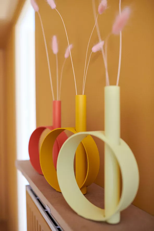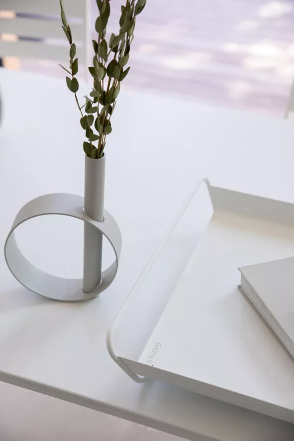 De Ios vaas van Fermob heeft een lengte van 15 centimeter, een breedte van 4,5 centimeter en een hoogte van 23 centimeter. De vaas is gemaakt van waterdicht aluminium en weegt 0,42 kilogram. Ios is verkrijgbaar in verschillende kleuren.
