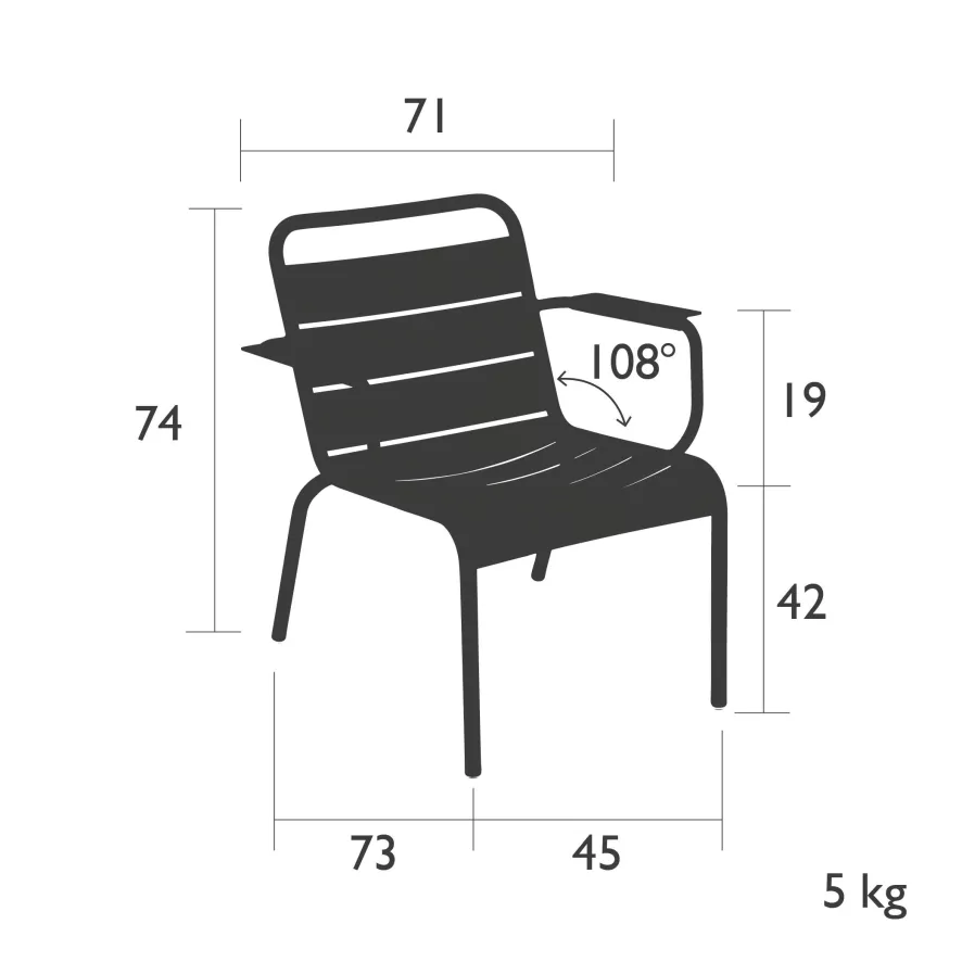 De Luxembourg lounge fauteuil met armleuning van Fermob is 73 centimeter lang, 71 centimeter breed en 74 centimeter hoog. De zithoogte bedraagt 42 centimeter en de zitbreedte 45 centimeter. De hoogte van de zitting tot de armleuningen bedraagt 19 centimeter. Het frame is gemaakt van gepoedercoated buisvormig aluminium, de zitting en rugleuning gemaakt van gebogen aluminium lamellen en de armleuningen van aluminium latten. Je kan zes fauteuils op elkaar stapelen. De lounge fauteuil weegt 5 kilogram. De Luxembourg heeft een twee verschillende fauteuils met armleuningen. De Lounge fauteuil en de Low fauteuil. Deze Lounge variant is iets hoger dan de Low en ook de rugleuning staat ietsje meer omhoog 108 graden tegen de Low fauteuil met 113 graden. Dus bij de Low fauteuil zit je iets meer achterover. Â